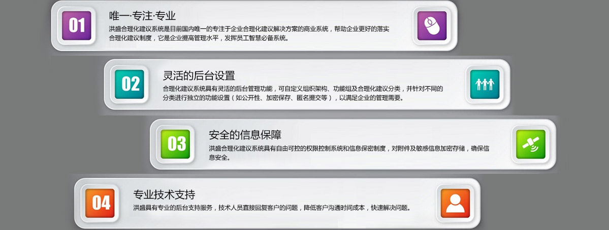 洪盛合理化建議系統(tǒng)專注于企業(yè)合理化建議解決方案的商業(yè)系統(tǒng),幫助企業(yè)更好的落實(shí)合理化建議制度,它是企業(yè)提高管理水平,發(fā)揮員工智慧必備系統(tǒng)。